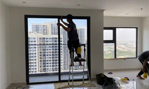 Thi công dán phim cách nhiệt cho toàn bộ khối các vách kính mặt tiền...