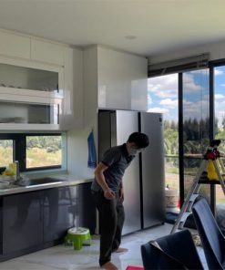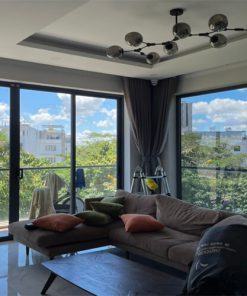 Hình ảnh sau khi thi công: Từ bên trong nhìn ra ánh sáng đi qua cửa kính có hiệu ứng đổi màu xanh sáng dịu nhẹ làm cho mắt không bị chói nhưng vẫn giữ được ánh sáng vào ngôi nhà đầy đủ.